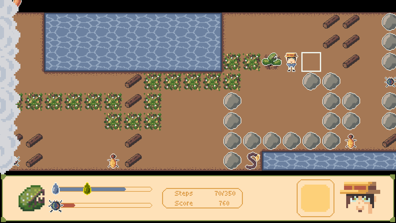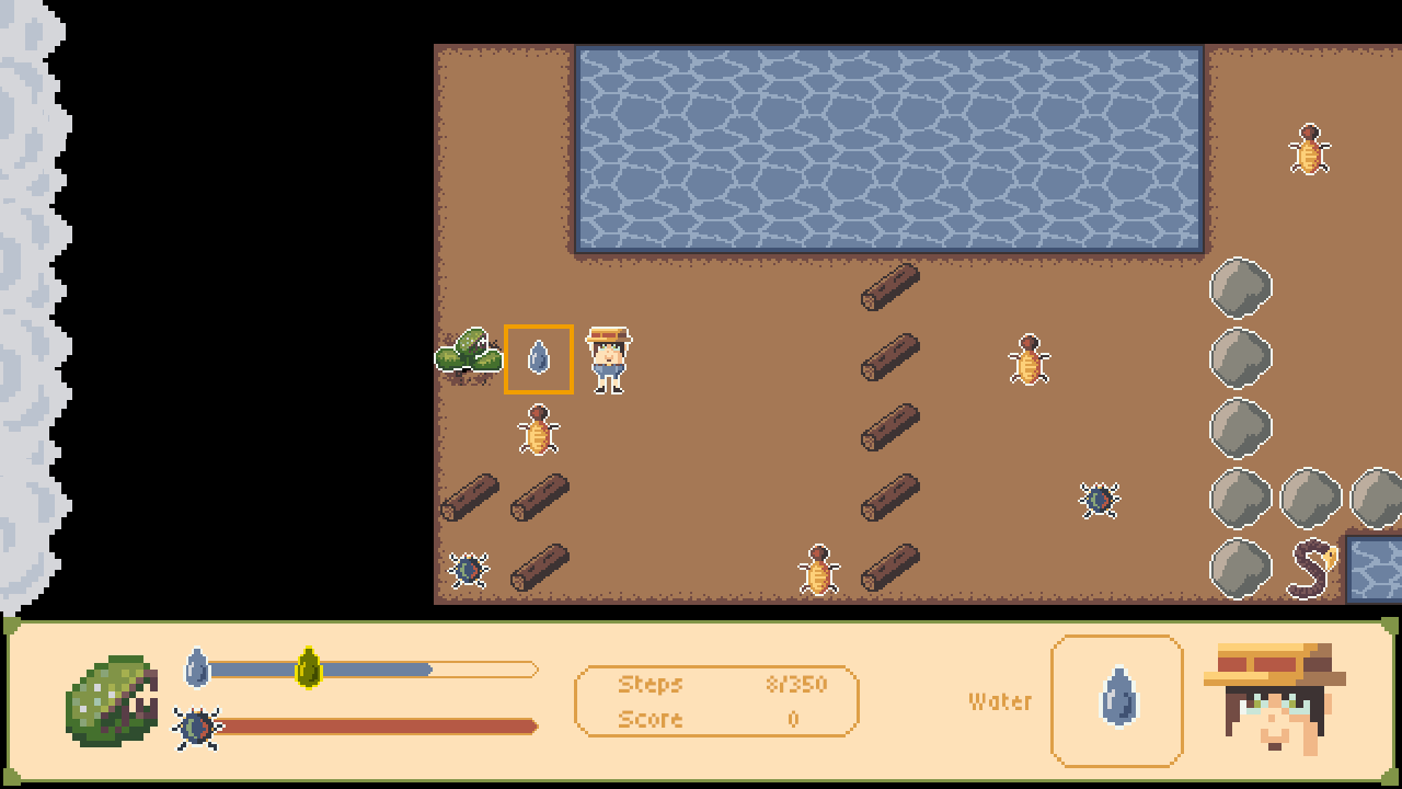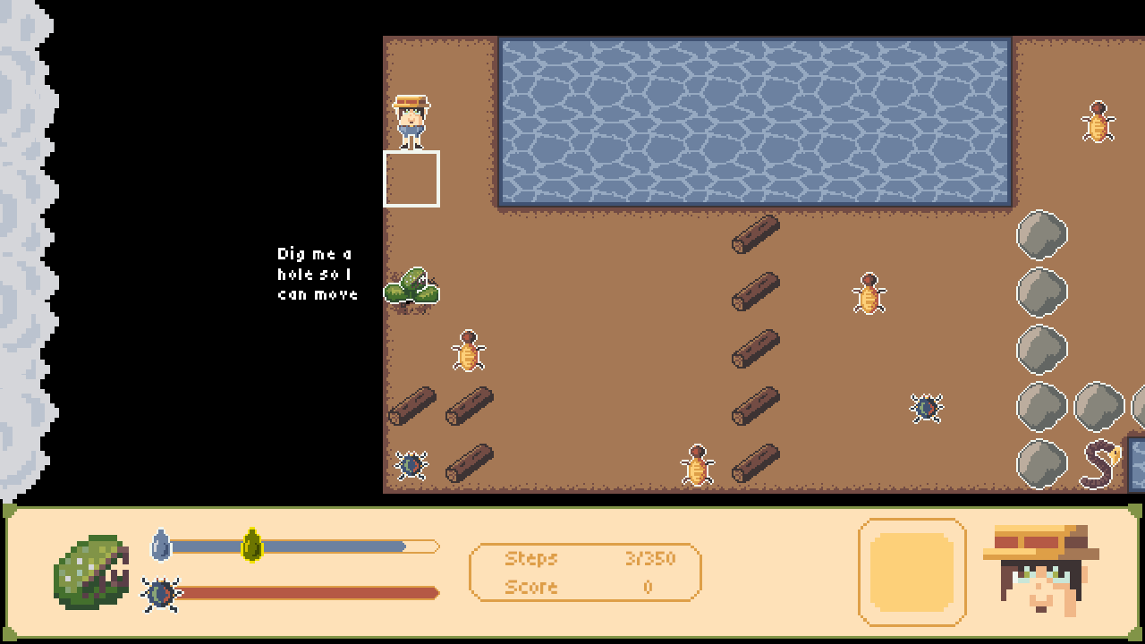 “Feed Me Some More” is a turn-based plant survival puzzle. When you move, time progresses. Thirst increases with every step. Hunger increases with every plant move.
